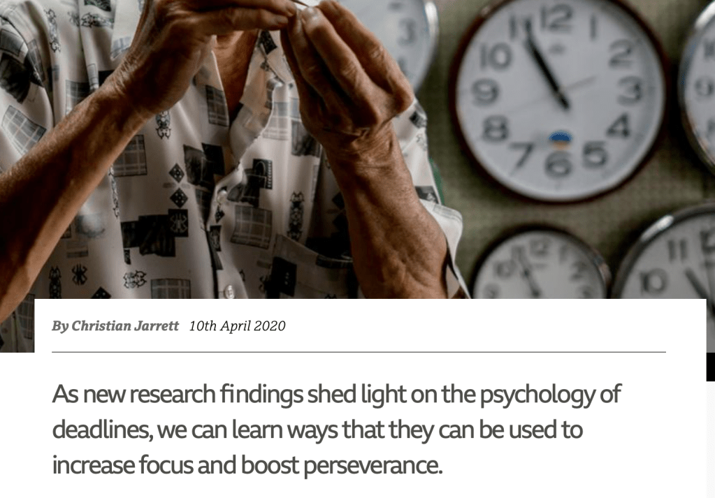Posted on April 26, 2020April 26, 2020 by Christian JarrettNew BBC article on the motivational power of deadlines How to make deadlines motivating, not stressful – BBC WorkLife Share this: Click to share on X (Opens in new window) X Click to share on Facebook (Opens in new window) Facebook Click to share on LinkedIn (Opens in new window) LinkedIn Like Loading... Related