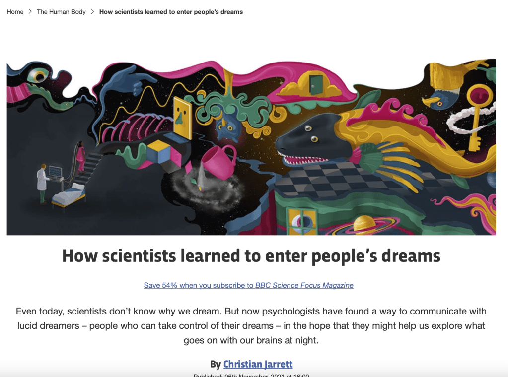 Posted on November 6, 2021December 24, 2021 by Christian JarrettChristian authors a feature on lucid dreaming for BBC Science Focus magazine Share this: Click to share on X (Opens in new window) X Click to share on Facebook (Opens in new window) Facebook Click to share on LinkedIn (Opens in new window) LinkedIn Like Loading... Related